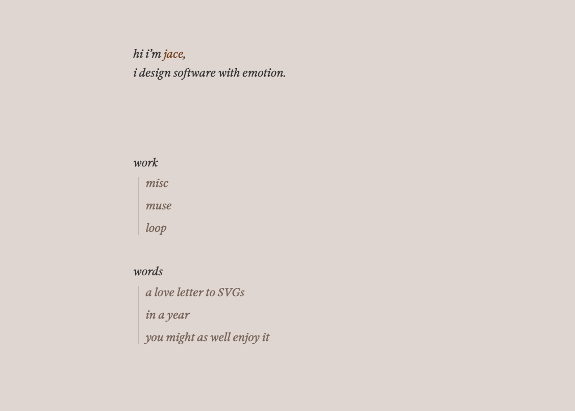 28 Sep 2024 ja.mt Personal website of Jace. I liked the minimalism and micro-interactions combo which makes the site fun. ja.mt